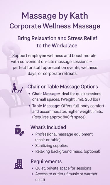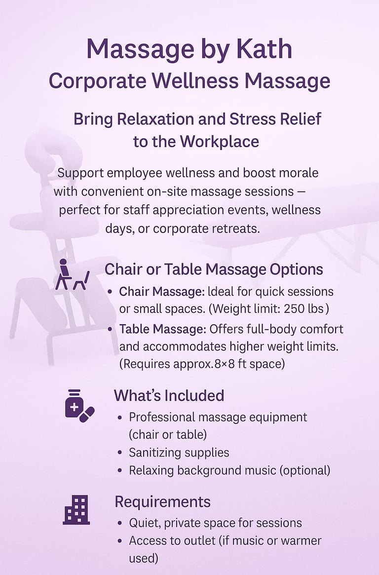 Massage by Kath offers on-site Corporate Chair Massage designed to reduce stress, increase productivity, and support employee wellness. This service is perfect for staff appreciation days, wellness events, corporate celebrations, conferences, or routine monthly visits.